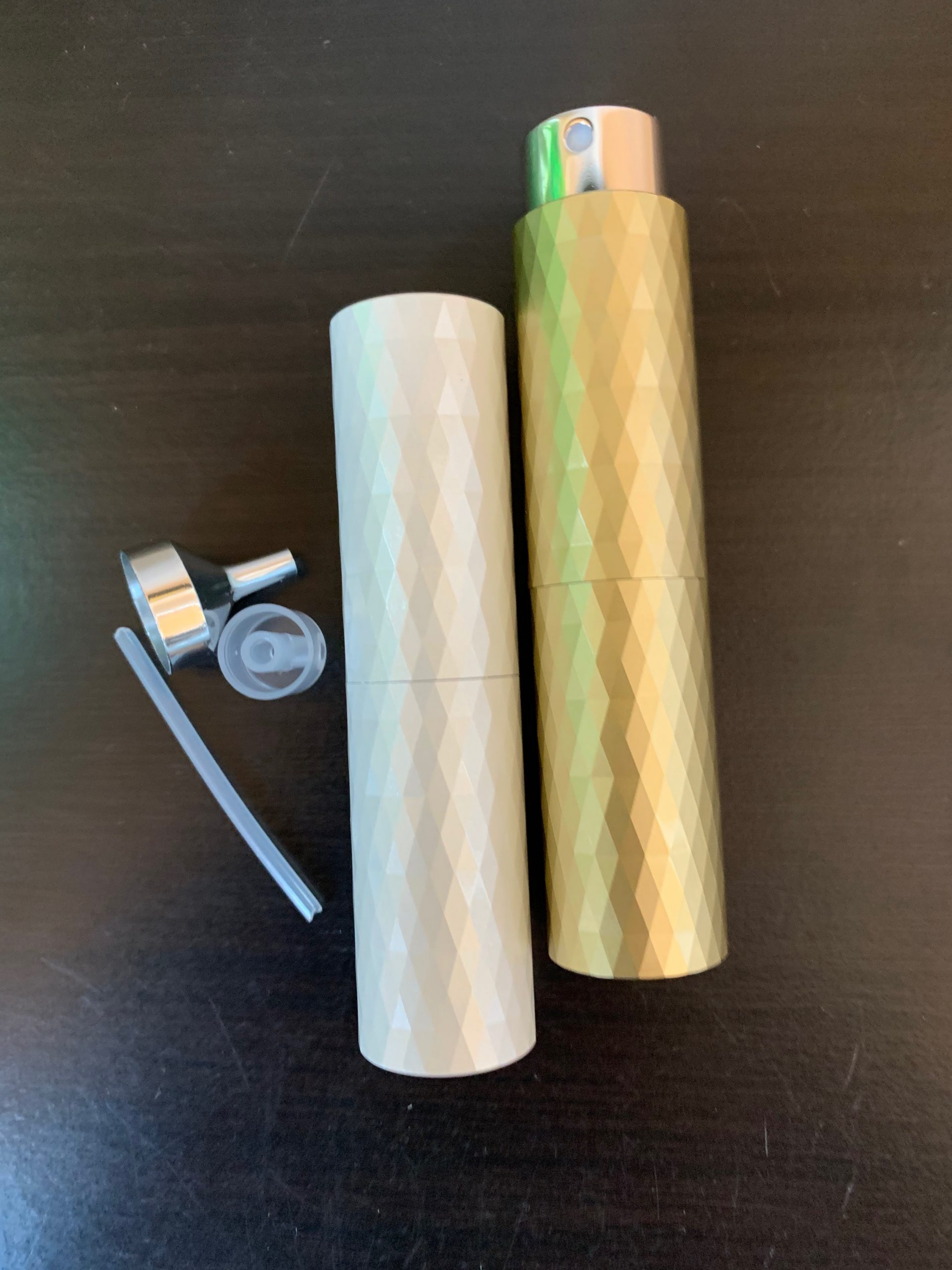 The LePlatom perfume atomisers refillable travel perfume dispensers are really great, they feel and look lovely! The diamond-like design is really nice and modern and the colours of both of the dispensers complement each other well.
