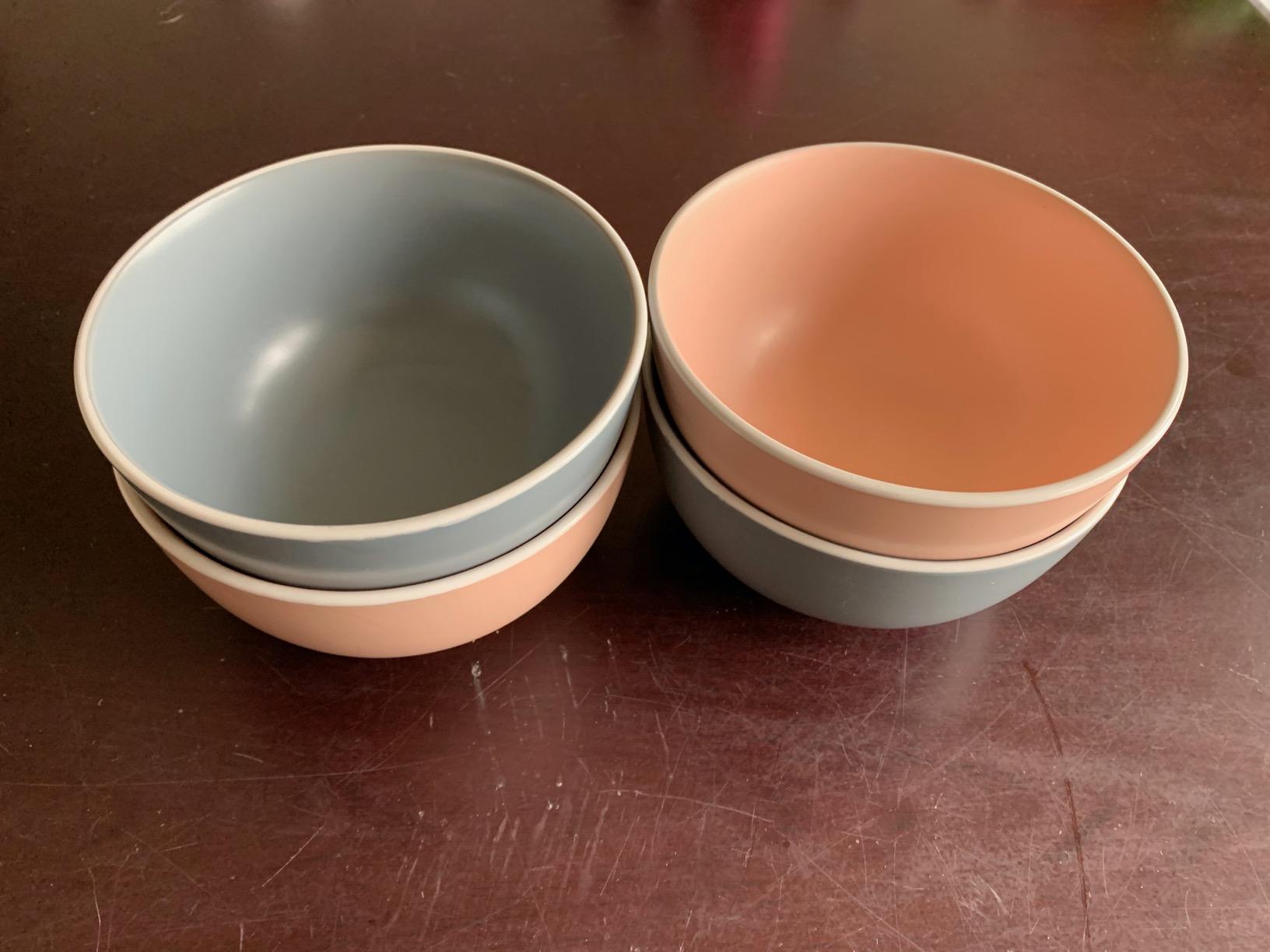 When these turned up we were very impressed with the feel of them, they feel very high quality and sturdy. One of the best things about them is the contrasting finishes, on the exterior of the bowl there is a matte finish which not only looks nice but also makes them easier to grip, whereas on the inside the finish is shiny making it easier to clean. We like the colours, the combination of the two colours means that we can mix and match between me and my partner.