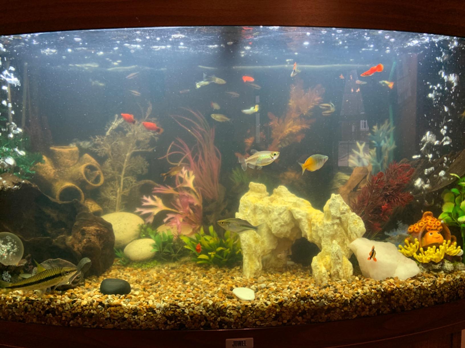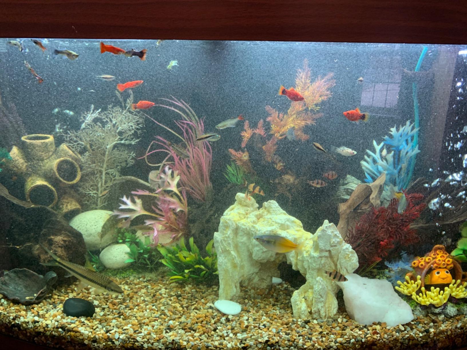 So I decided to use this after a water change, as you can see in the first photo attached of our tank, the water full of little particles of debris that we would rather not have in the tank. But the water itself is very clean and clear. This was straight after we finished the water change. I added the quick clear liquid as soon as possible to give it a good test, first off when opening the cap you will notice they have kindly included an inner measure to the cap for smaller tanks which is a nice touch. For our tank with is 230 litres I needed to use 3 of the larger measures, I mixed it with a cup of water as suggested and added it to the tank.