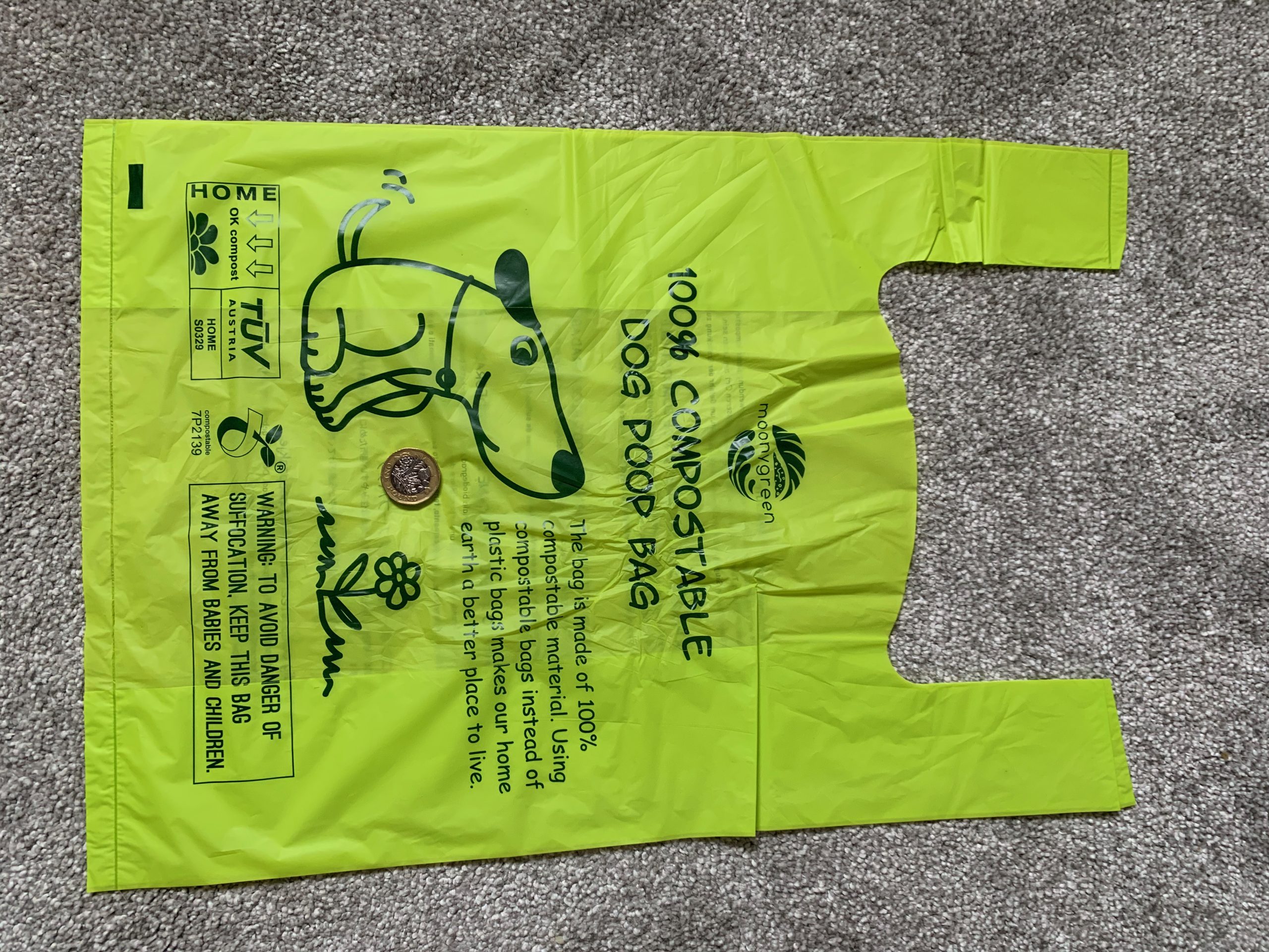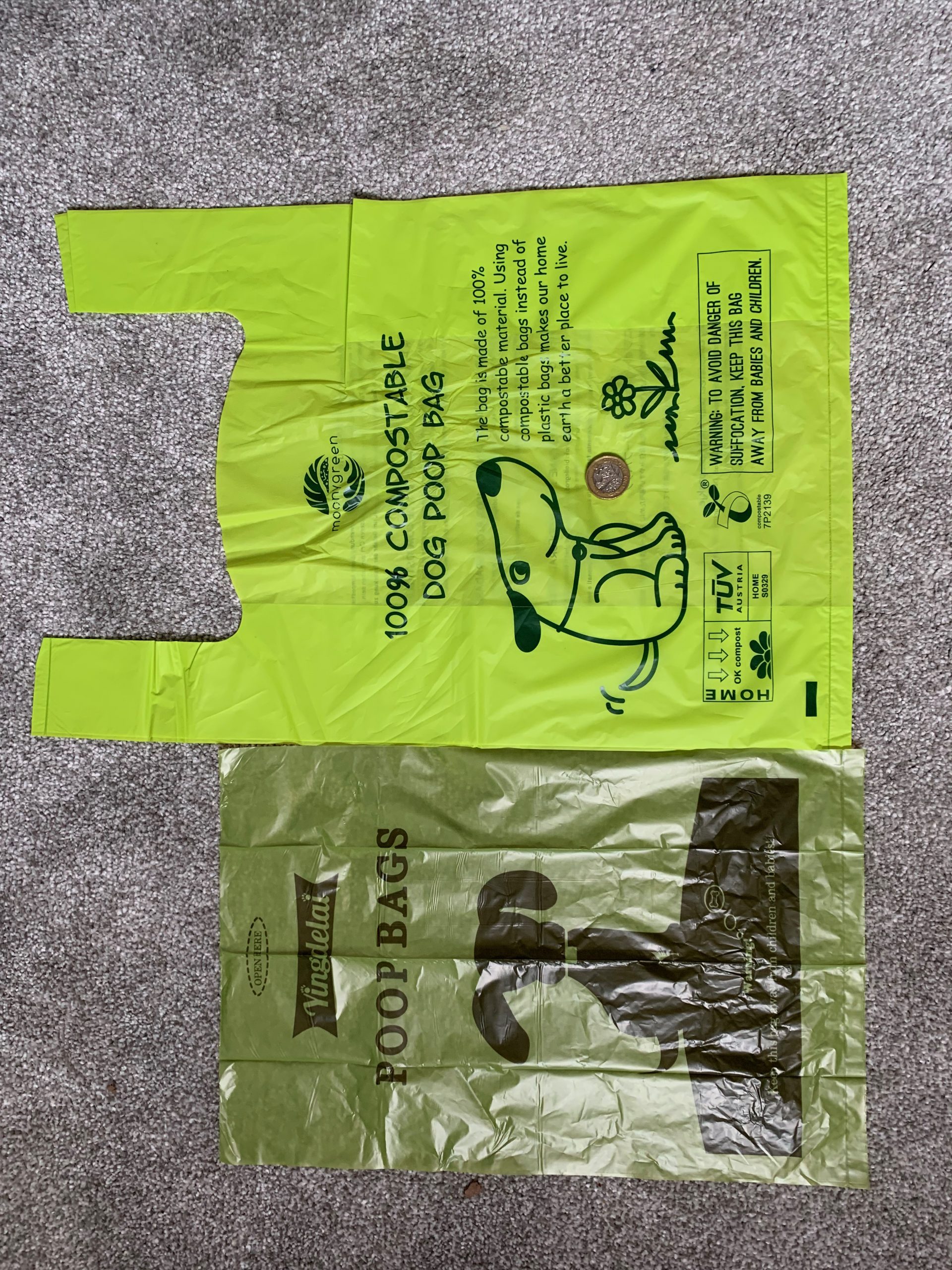 When I had the first bag in my hands, I was really surprised just how big the bag felt, we have a large labrador so thought I would play it safe and order the large size, but really I think the small would have been fine, these are huge. I have included a photo of the bag with a one-pound coin on for size comparison. I was have included an image of the bag next to a much cheaper brand that I was using before these, you can tell from the image there is a slight size difference, I would say that the cheap one is a normal poo bag size, maybe a little bigger than some. But you can see in the comparison that the material used in these poo bags is much less shiny and has a nice matte texture which feels nice and means that separating the bag for use is easy and there is no need to lick your fingers!